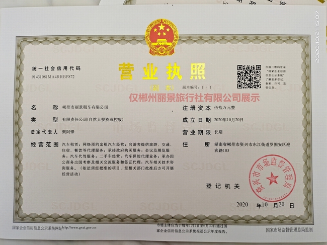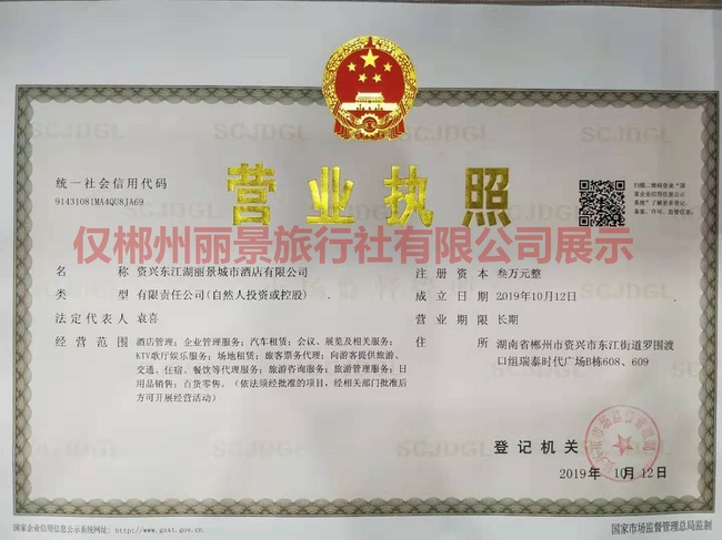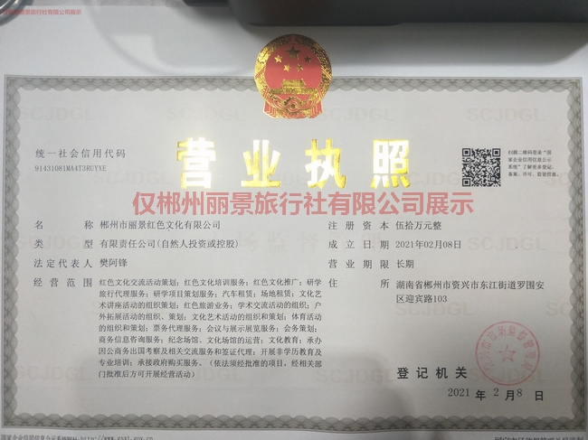 為彰顯誠信旅游環(huán)境,讓廣大客戶放心選擇我們,郴州麗景旅行社有限公司公開展示旗下旅游產(chǎn)業(yè)工商信息。用我們的產(chǎn)品讓您的生活更美好!