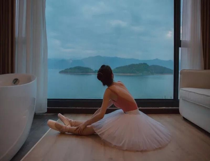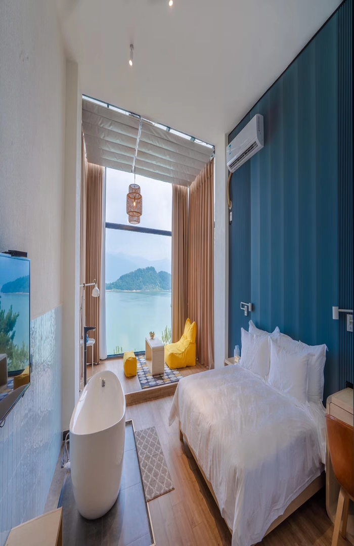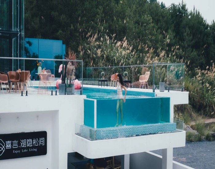 這里有無邊際泳池,實現水天一色的精致,更有網紅房皓月般通透的湖景和松林影印的綠意盎然。