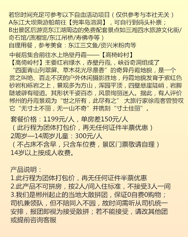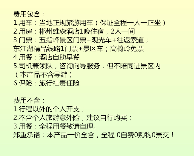 DAY1:郴州市區(qū)接團(tuán)一莽山·五指峰景區(qū)一入住郴州雄森酒店8點(diǎn)左右郴州市區(qū)(具體時間地點(diǎn)以出發(fā)前一天工作人員通知為準(zhǔn))接貴客前往【莽山·五指峰景區(qū)】,由中景信集團(tuán)的歷數(shù)三年,巨資投入、超前規(guī)劃、人性設(shè)計、精工建設(shè)及匠心打造,南中國最長懸空棧道:總長約8公里,海拔1400米至1600米,兩層棧道,全程無障礙觀光環(huán)線,登高山、臨絕壁如履平地,盡享“非人”奇遇。乘坐中國目前最長索道單線的觀光纜車;游玩時間約5小時。中餐晚餐自理,晚上入住郴州雄森國際假日酒店。第二天:霧漫小東江一龍景峽谷一高椅嶺--郴州送團(tuán)早上6點(diǎn)半左右酒店接團(tuán)前往【霧漫小東江】,偉大的思想家孔子曾經(jīng)說過“仁者樂山,智者樂水”而東江湖正是有山有水它集江南名山秀水的旖旎風(fēng)光于一體,自然景觀與人文景觀交相輝映。景區(qū)面積200平方公里,160平方公里的湖面煙波浩淼平均水深51米,最深處達(dá)157米,蓄水量達(dá)81.2億立方米的湖水 晶瑩透澈,被譽(yù)為“湘南洞庭”,數(shù)十個島嶼星羅 其中,被稱為“東方瑞士“溫馨提示:霧漫小東江屬于溫差產(chǎn)生的自然景觀,可遇不可求哦!景區(qū)有安排漁夫撒網(wǎng)表演哦。觀霧后沿小東江觀霧棧道往上游走到3號或者4號站臺,繼續(xù)乘坐景區(qū)環(huán)保車前往終點(diǎn)站一東江大壩旅游碼頭。抵達(dá)大壩后可前往【龍景峽谷瀑布群】(參考時間約1.5小時)龍景峽谷全線游程2.5公里??瓷阶钌絼荻盖?,青山滴翠,古木參天;觀水景,一條清澈的溪流在峽谷中穿行,瀑布成群。沿途可以觀賞到煙竹山瀑布、龍景瀑、龍吟瀑、三疊瀑、龍卷瀑、鴛鴦瀑等形態(tài)各異的瀑布和古松坳、連理樹、龍鱗石等千姿百態(tài)的景點(diǎn)。