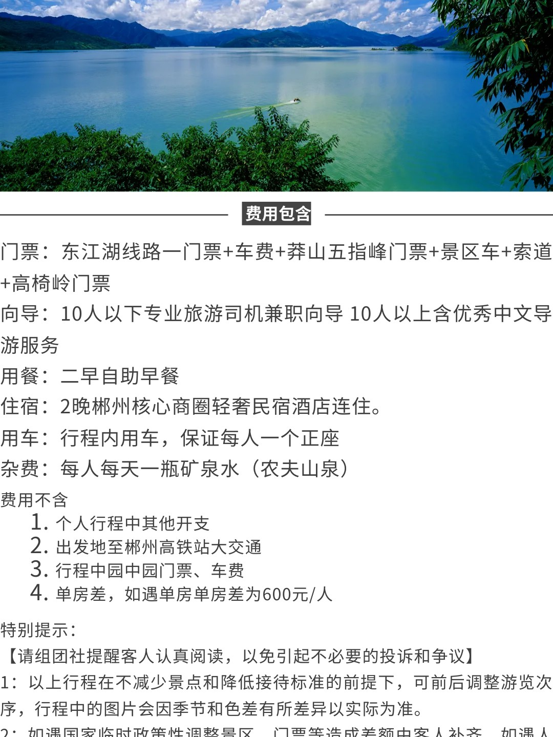 早晨享用早餐后前往【東江湖景區(qū)】參觀中華奇觀霧漫小東江散步小東江觀霧棧,之后乘車前往東江大壩旅游碼頭。東江湖湖面面積160平方公里,湖面煙波浩淼,平均水深51米,深處可達157米,蓄水高達81.2億立方米,相當(dāng)?shù)挠诎雮€洞庭湖大,因此被譽為“湘南洞庭”,數(shù)十個島嶼星羅其中,被稱為“東方瑞士”之后前往【龍景峽谷景區(qū),峽谷內(nèi)有堪稱南國最大的瀑布群--龍景十八瀑;是國內(nèi)的天然氧吧!是我國目前瀑布密集最高的景區(qū),有大小瀑布26處,水潭18個,是國內(nèi)罕見的高負離子區(qū)。中午中餐自理,下午可自由前往三湘四水旅游文化街參觀,15點集合乘車前往郴州高鐵站結(jié)束行程。