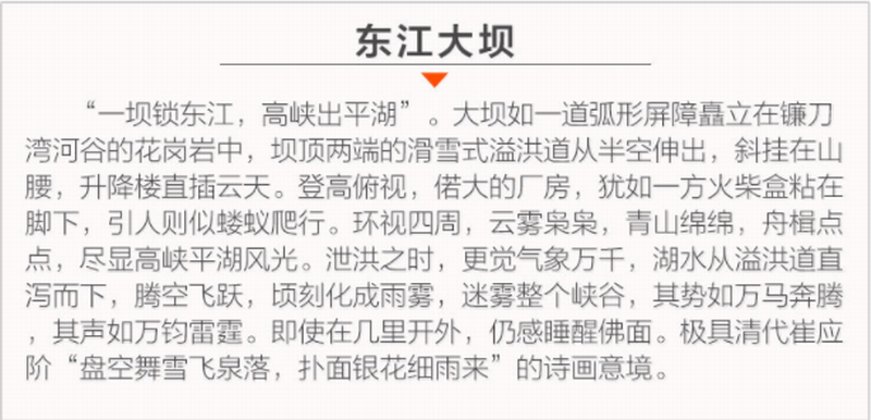 9點(diǎn)集合前往亞洲——東江大壩旅游碼頭。東江湖景區(qū)面積200平方公里,160平方公里的湖面煙波浩淼,平均水深51米,深處達(dá)157米,因?yàn)樗w較深,所以蓄水量相當(dāng)大。達(dá)81.2億立方米的湖水晶瑩透澈,相當(dāng)?shù)挠诎雮€(gè)洞庭湖,因此被譽(yù)為“湘南洞庭”,數(shù)十個(gè)島嶼星羅其中,被稱為“東方瑞士”。到達(dá)東江大壩旅游碼頭后前往龍景峽谷景區(qū)。龍景峽谷位于東江大壩右側(cè),峽谷內(nèi)有堪稱南國大的瀑布群--龍景十八瀑;是國內(nèi)大的天然氧吧!沿途山勢(shì)陡峭,青山滴翠,古木參天,清潭、瀑布成群,是我國目前瀑布密集最高的景區(qū),有大小瀑布26處,水潭18個(gè),是國內(nèi)罕見的高負(fù)離子區(qū)。龍呤瀑、鴛鴦瀑、東江大壩等景點(diǎn),中午自行在東江大壩用中餐。