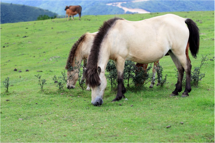 湖四周是茂盛的次原始森林,像一道天然屏障將牧場(chǎng)圍成一個(gè)世外桃源。每年春耕過后,村民便把牛馬羊放至仰天湖,任其自由自在無拘無束地生活幾個(gè)月,待入冬欲下雪時(shí)再去找回來。有時(shí),放出去的是兩頭牛,找回來時(shí)卻成了三頭,原來牛夫婦已有了愛的結(jié)晶。這種特殊的放牧方式被當(dāng)?shù)厝嗽娨獾亟谐?ldquo;漂流”。